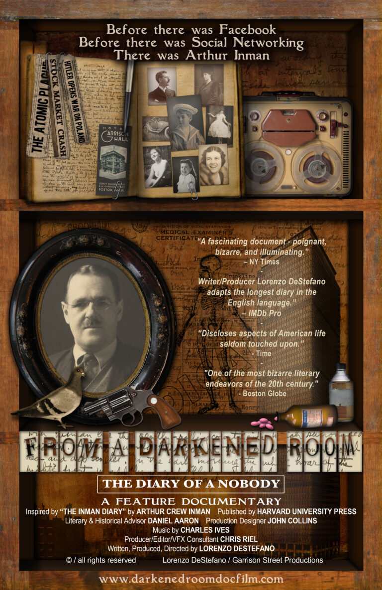 “FROM A DARKENED ROOM – The Diary of a Nobody” is an upcoming feature documentary from award-winning Writer/Producer/Director Lorenzo DeStefano of Garrison Street Productions and Producer/Editor/VFX Consultant ChrisRiel of Storyline Entertainment. An epic of collective memory set in Boston, the film chronicles the true story of the notorious American eccentric Arthur Crew Inman (1895-1963), author of the 17 million word / 155 volume “INMAN DIARY”, published by Harvard University Press, under exclusive license to DeStefano.